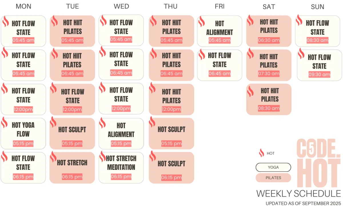Infrared heat loosens tight muscles and enhances flexibility, helping you move deeper into poses, reduce stiffness, and improve overall joint health.CodeHot Timetable